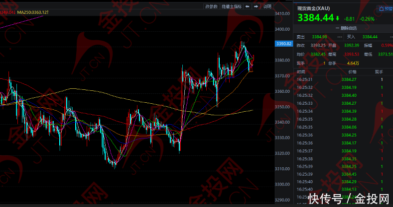隔夜,现货黄金收盘上涨28.02美元,涨幅0.83%,报3393.62美元,是8月11日以来最高。今日欧市盘中,黄金小幅下跌,目前在3383美元附近徘徊。
