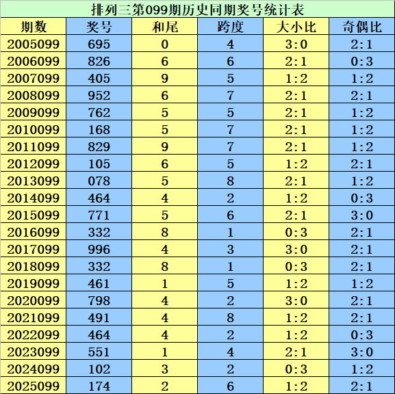 从2004年至今排列三已开出7573期奖号了,本期为排列三2026年第099期开奖,历史同期已出现21次奖号:
